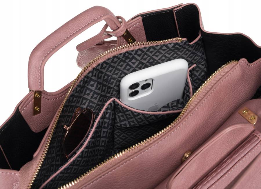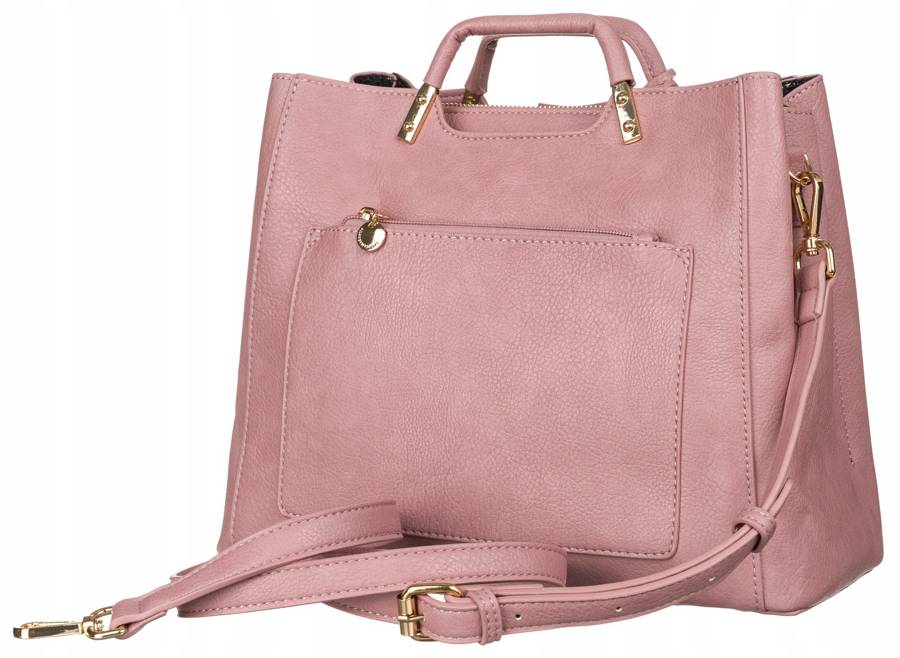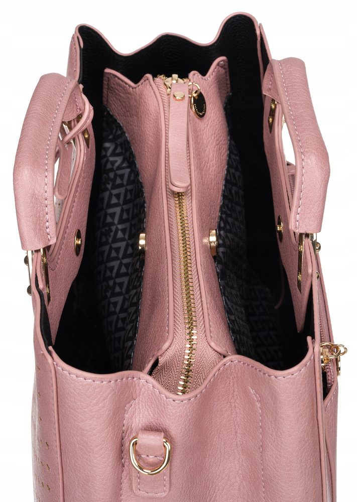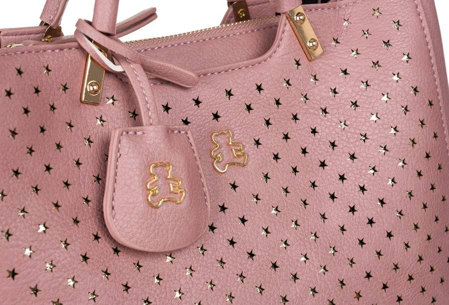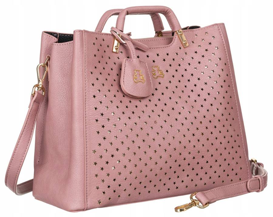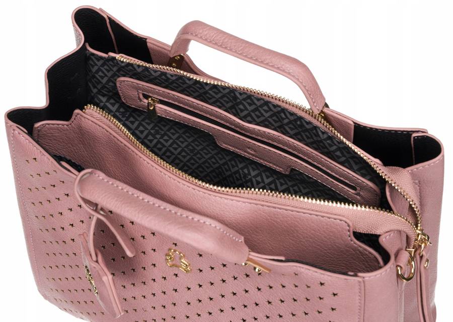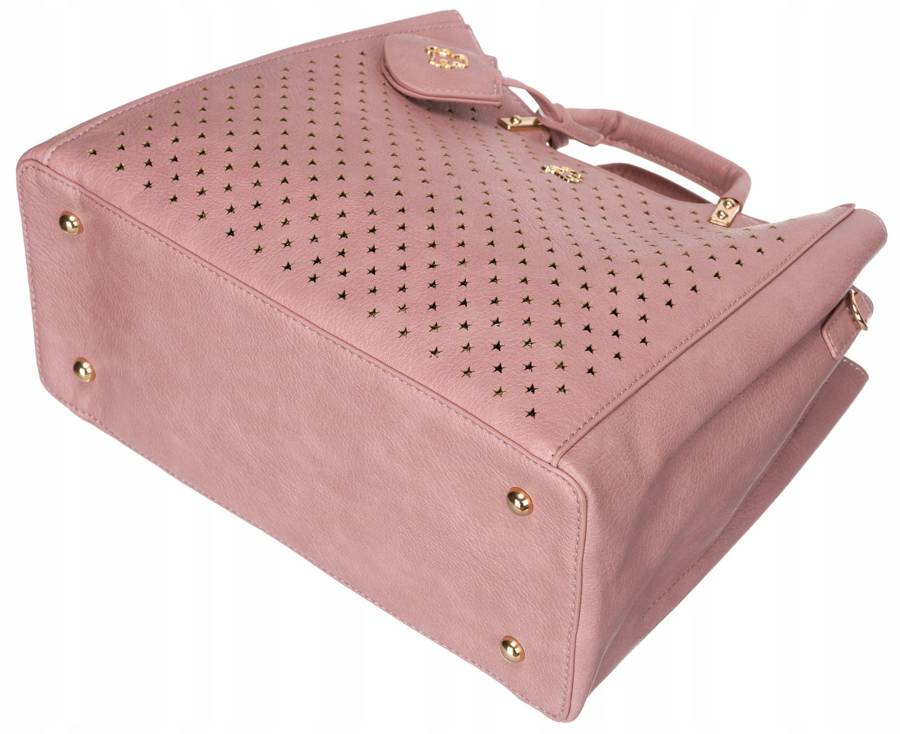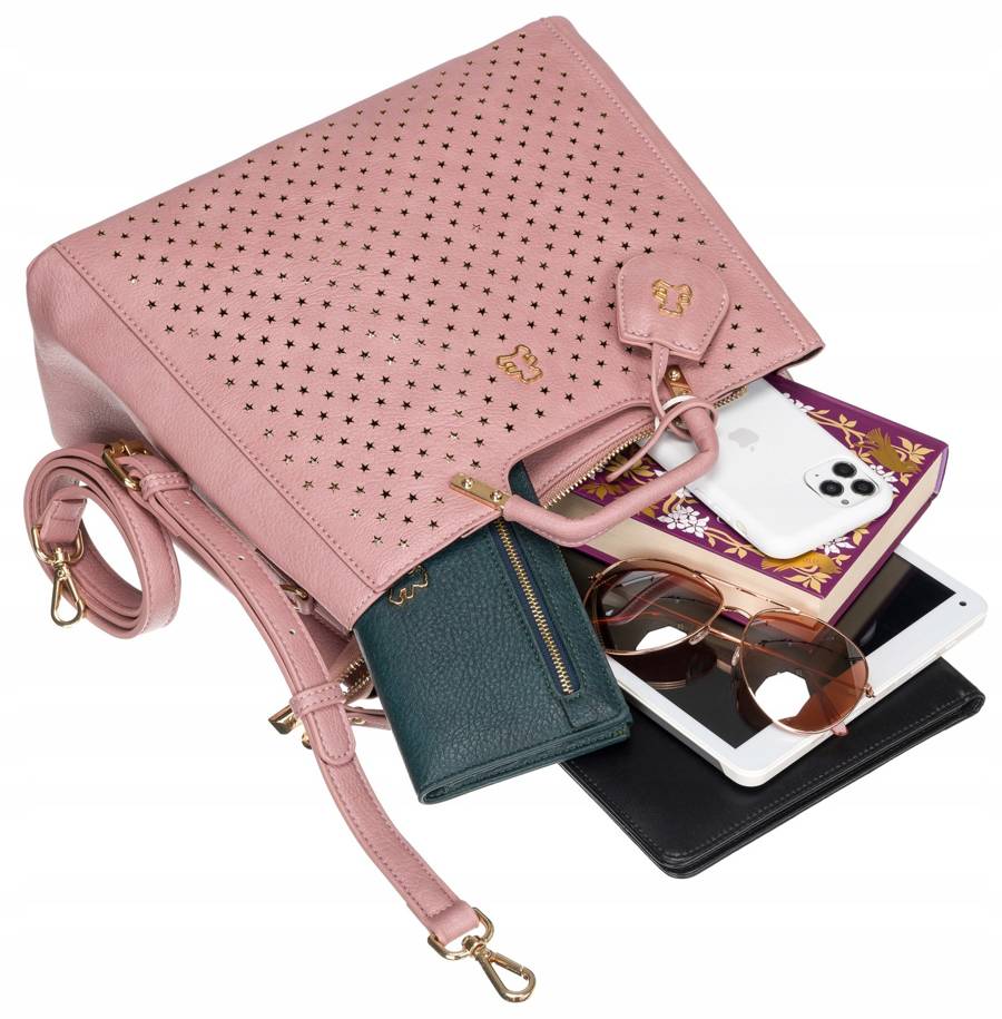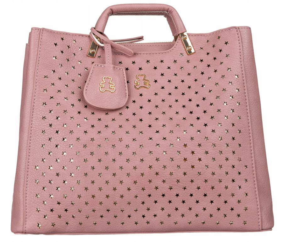 Torba odszyta ze skóry ekologicznej. Środek na podszewce. Front torebki zdobią ażurowe gwiazdki. Trzykomorowa z 3 kieszeniami. Torebka zawieszona jest na wygodnych, uchwytach na dłoń. Dodatkowo posiada doczepiany pasek do noszenia na ramieniu.